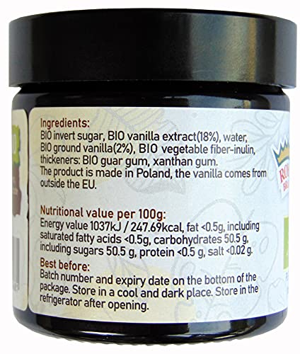 Ingrediënten: bio inversuiker, bio vanille extract (18%), water, bio gemalen vanille (2%), bio plantaardige vezel-inuline, verdikkingsmiddelen: bio guargom, xanthaangom.