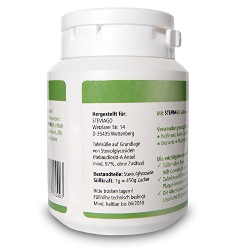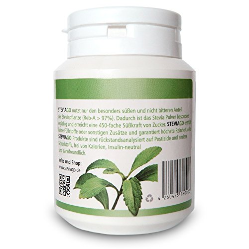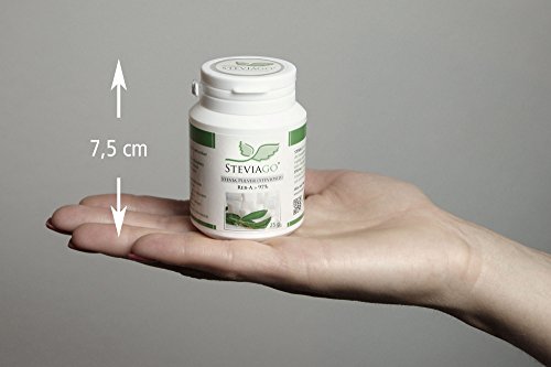 Het Stevia-poeder van Steviago heeft een zeer hoge zuiverheid en bestaat uit 100% puur steviolglycoside, zonder andere toevoegingen. Het aandeel rebaudioside A (ook Reb-A genoemd) bedraagt meer dan 97%. De overige 3% van het poeder bestaat uit andere bestanddelen van de plant. Rebaudioside-A is het zoetste en niet-bittere bestanddeel van de Stevia-plant. De Steviolglycoside Rebaudiosid-A (Reb-A) wordt bij Steviago zorgvuldig in een complexe en voorzichtige procedure uit de plantenbladeren geëxtraheerd. Daardoor bereikt SteVIAGO een 450 keer zoetkracht van suiker, heeft 0 calorieën en heeft zelfs een positief effect op de tandgezondheid omdat plak remt en niet ruigeen. Stevia is hypoallergeen en daarom optimaal geschikt voor diabetici.
