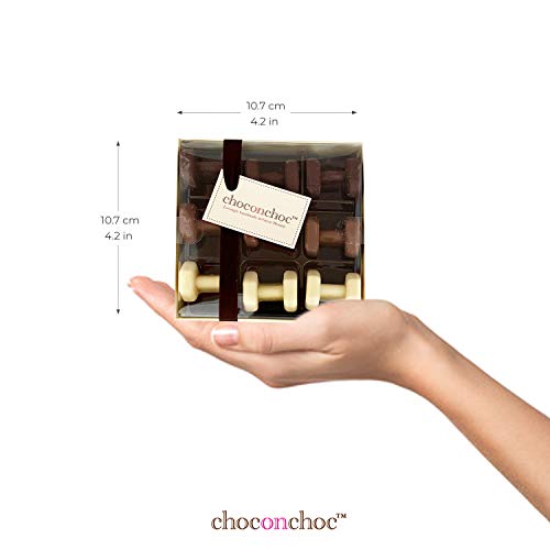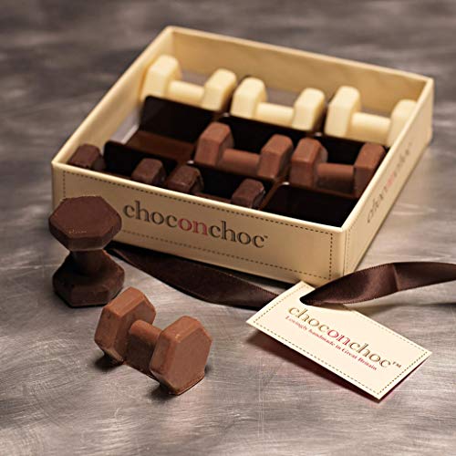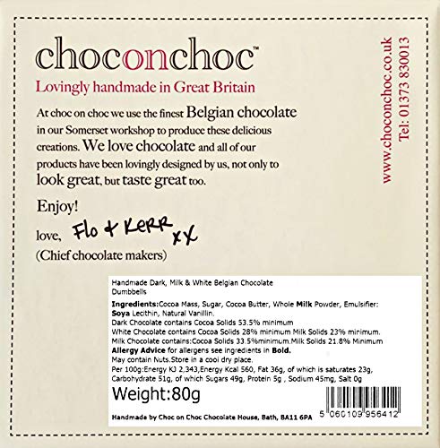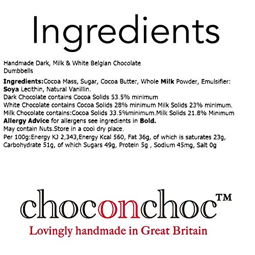 Choc on Choc maakt met de hand mooie chocoladegeschenken met alleen de beste Belgische chocolade. Deze doos bevat 3 donkere, 3 melk en 3 witte chocoladehaltergewichten een geweldige beloning na een zware training in de sportschool of voor degenen die minder actief en liefdevol aan de sportschool denken. Gepresenteerd in een Choc on Choc geschenkdoos met lint en tag dit maakt een geweldig nieuwigheidscadeau dat groot genoeg is om te delen. De ambachtelijke chocolatiers worden in Somerset geproduceerd en maken elk stuk chocolade met de hand af en maken het af. Het creëren van deze unieke individuele leuke chocolaatjes is een passie die beloond wordt als je of de ontvanger glimlacht.