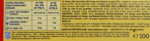 Inhoud: 20 x 100 g toblerone witte chocolade met honing amandel nougat (10%) / Zwitserse witte chocolade met honing en amandelnougaat in de legendarische driehoekige vorm.