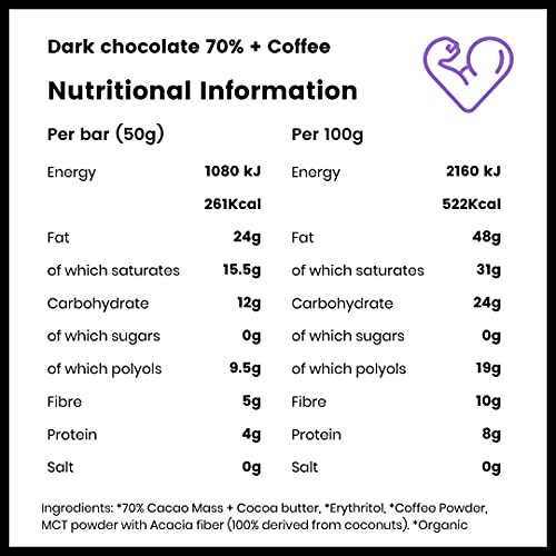 ZUIVERE CHOCOLADESMAAK – De vegan chocoladereep bestaat uit verschillende onmisbare ingrediënten: biologische cacao uit Peru, erythritol en MCT-oliepoeder gewonnen uit 100% kokosnoot en koffiesmaak voor optimaal genot.