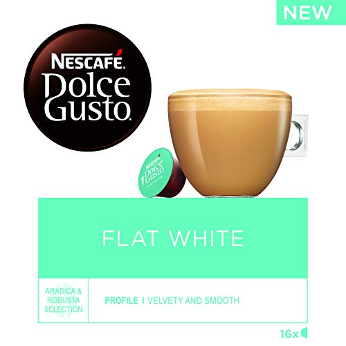 NESCAFÉ Dolce Gusto Flat White. Deze koffie bestaat uit volle melkpoeder en instant koffie. Deze Australische trend bestaat uit een sterke espresso, voorzichtig overgoten met melk. Makkelijk te zetten met Dolce Gusto koffiecups.