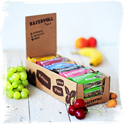 Hier krijg je 6 lekkere soorten in de praktische 18-delige mixbox (elk 3 rekken à 65 g per soort). Hennep & zure kersen: wordt geleverd met knapperig hennepzaden en sprankelende zure kersen. Deze variant is zonder noten. Opmerking: kunnen stukjes schalen en pitten bevatten. Banaan & Paranuss: is wereldkampioen geïnspireerd. Met deze Braziliaanse powernoot intus, mag tijdens het sporten in de zomer niets meer misgaan. Cacao & hazelnoot: sappige havervlokken verenigen zich met de fijnste cacao. De oplossing voor alle chocoladebruins. Deze lekkere muesligrendel Flapjack heeft zelfs een knapperige topping van hazelnoten, die voor de extra crunch zorgen. Naast de echte cacao bevinden zich kleine cacaobonen in de grendel. De exclusieve zoetstof voor alle HAFERVOLL fans! Klaver & abrikoos: hier komt de Balkan Connection! Wie gebruikt klaver voor zijn muesligrendel? We hebben de klaprozen op grond van zijn onbeschrijfbare aroma herleven. Mohn is zeer eiwitrijk en maakt gegarandeerd legaal afhankelijk! In combinatie met de frisse fruitige abrikozen en een paar smakelijke dadels, zorgt onze klaprozen flapjack voor een unieke smaak. Wie zegt dat muesligrendels saai moeten zijn? Cashew & Cranberry: echte mueslifans kunnen niet afzien van onze ongezout cashewpitten, die door hun zoete notenachtige smaak perfect bij de sprankelende cranberries. Wat voor een combo! De rode powerbessen zorgen ervoor dat je smaakknopen Breakdance dansen ’s nachts lang. Amandel & rosine: geen sluimerval kan de kaneelbruine en schattig smakende amandelen ontdoen. Omdat elk superteam uit twee helden bestaat, hebben we de amandelen aangevuld met fruitige rosinen, zodat de licht zoete smaak zich beter ontvouwt. Superteam amandel-rosine reddt de hond.