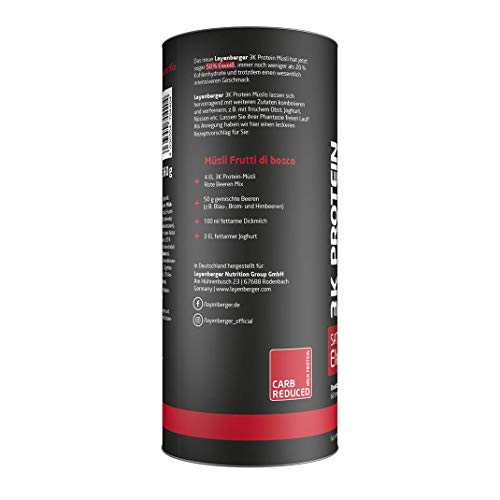 De nieuwe Layenberger 3K Protein Muesli heeft nu zelfs 50% eiwitten, nog steeds minder dan 20% koolhydraten en toch een veel intensievere smaak. Met de Layenberger 3K proteïne-muesli voor het ontbijt kan de dag goed en lekker beginnen. Layenberger 3K Protein Muesli kan uitstekend met andere ingrediënten worden gecombineerd en verfijnd, bijvoorbeeld Met vers fruit, yoghurt, noten enz. Laat je fantasie de vrije loop.