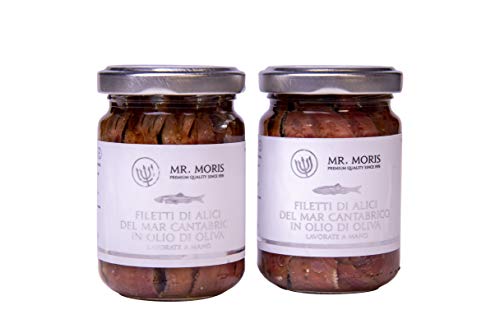 Met de hand gemaakt en laten rijpen gedurende een periode van niet minder dan 8 maanden. Pas als onze experts erkennen dat ze de juiste rijpheid hebben bereikt, is het vlees stevig en smaakvol en worden ze verpakt in olijfolie. Ansjovis Mr. Moris zijn een absolute gastronomische topkwaliteit van de wateren van de Cantabrische Zee. Ansjovisfilets die in de Cantabrische Zee worden gevangen, zijn dikker en smakelijker, zelfs vleziger, met een roze kleur die verandert in tabak en groter van formaat. Ze zijn dik en smakelijk met een delicaat laagje vet dat de smaak aangenaam beïnvloedt. De Cantabrische Zee kijkt uit over de noordkust van Spanje en verwelkomt een verscheidenheid aan ansjovis die verschilt van die in andere zeeën. De Cantabrische Zee, koud, rijk aan plankton en met sterke stroming, biedt de beste omgevingsomstandigheden voor de ansjovis die hier bijzondere kenmerken ontwikkelen. Om de koude temperaturen van deze wateren te overleven, groeien ansjovis meer en bouwen ze een grotere vetreserve op. De Cantabrische ansjovisvisserij vindt plaats tussen april en juni, wanneer de ansjovis de beste organoleptische eigenschappen heeft. Na het vissen voeren de zoutmeesters een zorgvuldige selectie uit en zouten ze in houten vaten genaamd “terzigni” om hun kwaliteit en oude texturen te garanderen. Alle ervaring en bekwame beoefening van hele generaties vertaald in dergelijk eenvoudig en smakelijk eten. Een product van zeer hoge kwaliteit, een heerlijk genot. De glazen pot kan niet liegen.